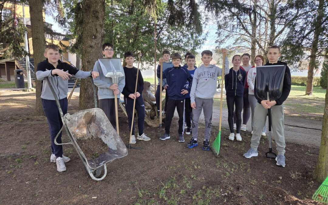 Danas su učenici 7. i 8. razreda zajedno s učiteljicom kemije Sanjom Dunaj iskoristili sunčan proljetni dan za uređenje školskog parka.