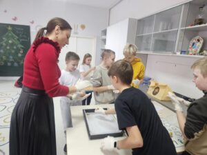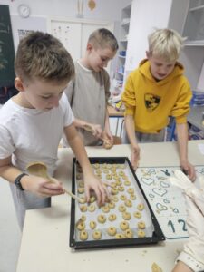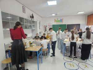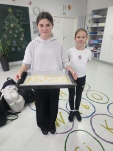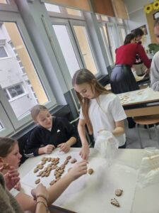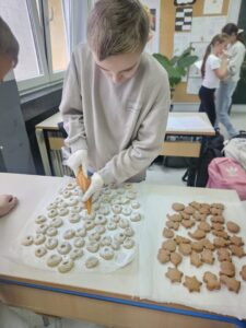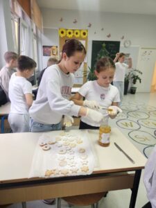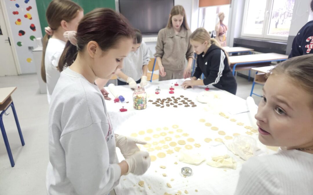 Učenici su s velikim zanimanjem valjali tijesto i oblikovali ga u razne božićne motive poput zvjezdica, snjegovića, borića i oraščića. Radili su u skupinama – jedna grupa pripremala je medenjake, druga husare, dok je treća izrađivala keksiće s marmeladom, popularne linzere.