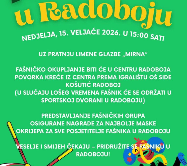 Kulturno-umjetničko društvo „Zagorec“ Radoboj, Osnovna škola Side Košutić Radoboj, Dječji vrtić Škrinjica, Muzej Radboa i Općina Radoboj pozivaju vas na veselo fašničko druženje u Radoboju, koje će se održati u nedjelju, 15. veljače 2026. godine, s početkom u 15:00 sati.